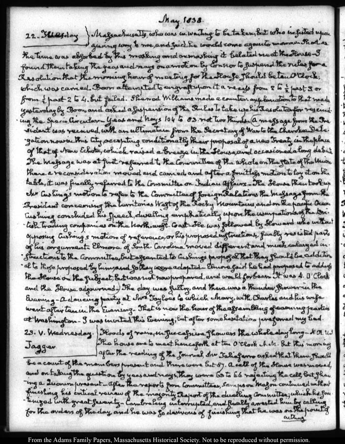 View full, authoritative transcriptions with page images of the diaries at John Quincy Adams Digital Diary part of the Primary Source Cooperative at the MHS.