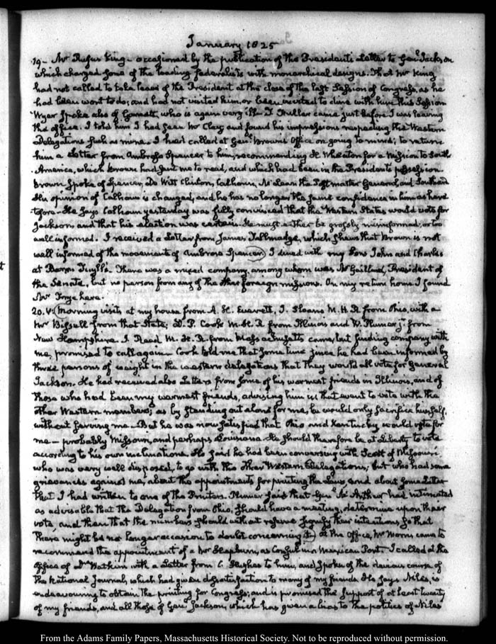 View full, authoritative transcriptions with page images of the diaries at John Quincy Adams Digital Diary part of the Primary Source Cooperative at the MHS.