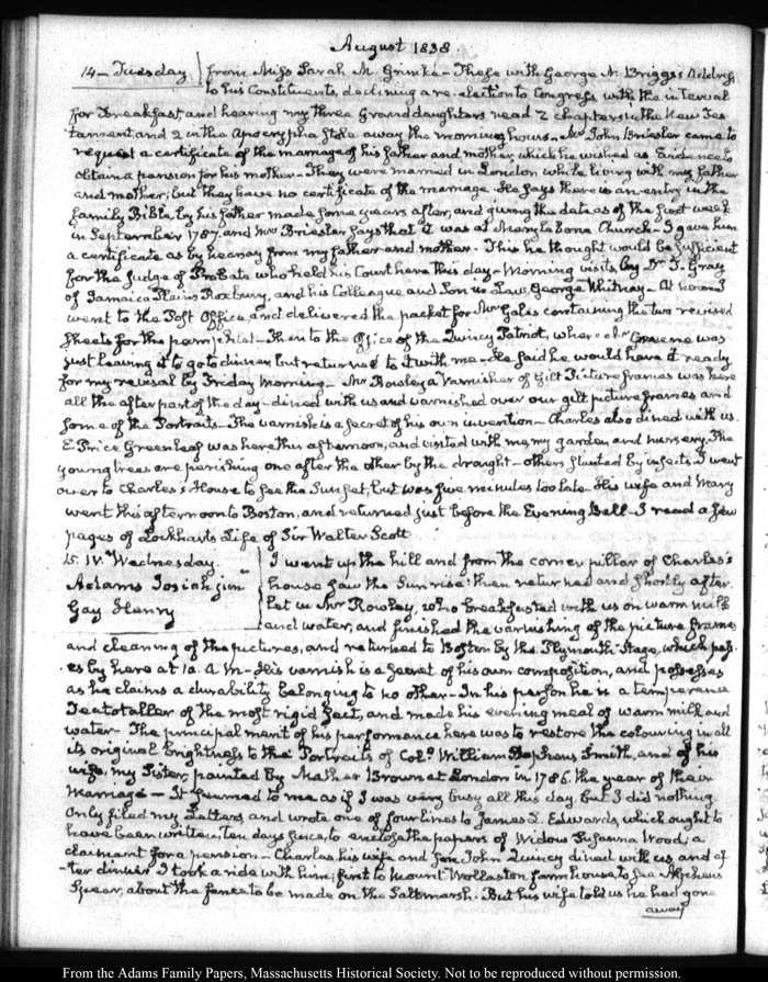 View full, authoritative transcriptions with page images of the diaries at John Quincy Adams Digital Diary part of the Primary Source Cooperative at the MHS.