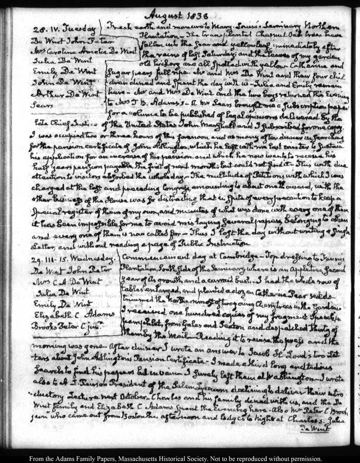 View full, authoritative transcriptions with page images of the diaries at John Quincy Adams Digital Diary part of the Primary Source Cooperative at the MHS.