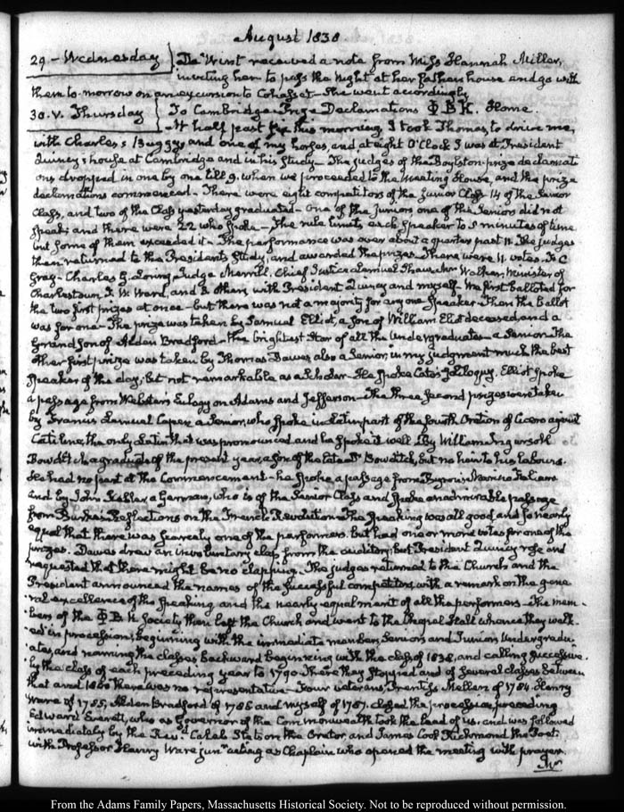 View full, authoritative transcriptions with page images of the diaries at John Quincy Adams Digital Diary part of the Primary Source Cooperative at the MHS.