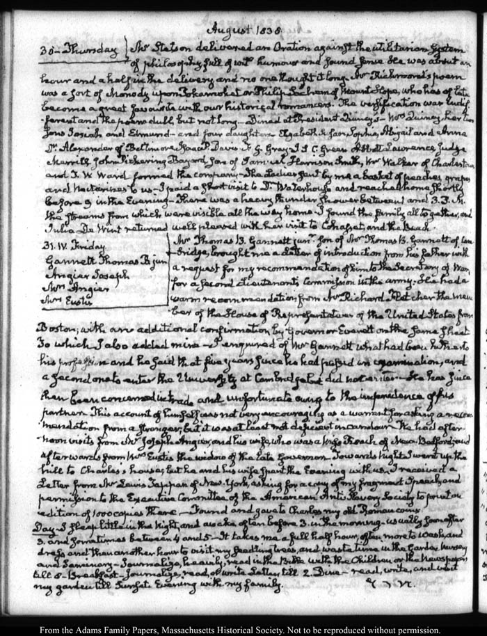 View full, authoritative transcriptions with page images of the diaries at John Quincy Adams Digital Diary part of the Primary Source Cooperative at the MHS.