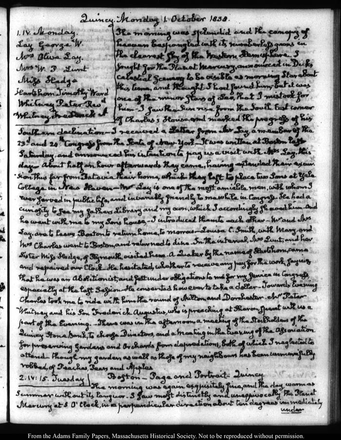 View full, authoritative transcriptions with page images of the diaries at John Quincy Adams Digital Diary part of the Primary Source Cooperative at the MHS.