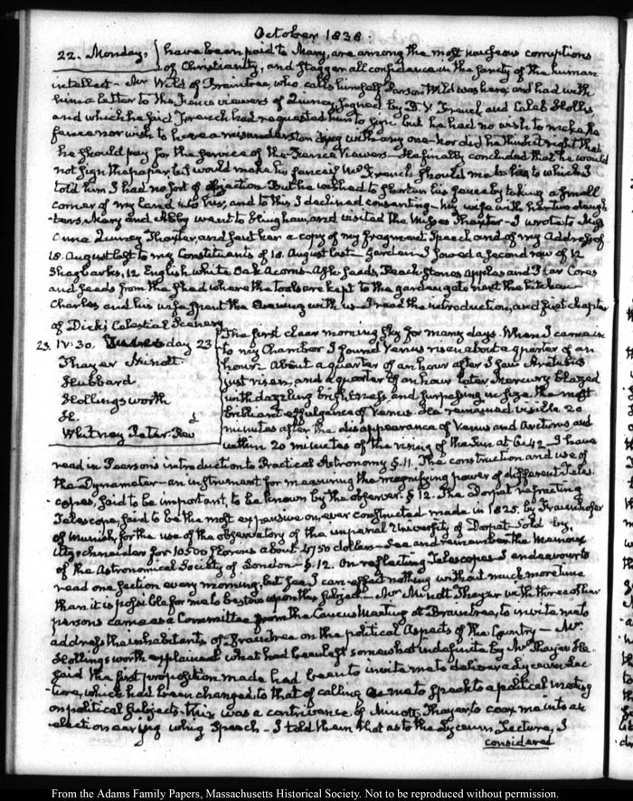 View full, authoritative transcriptions with page images of the diaries at John Quincy Adams Digital Diary part of the Primary Source Cooperative at the MHS.