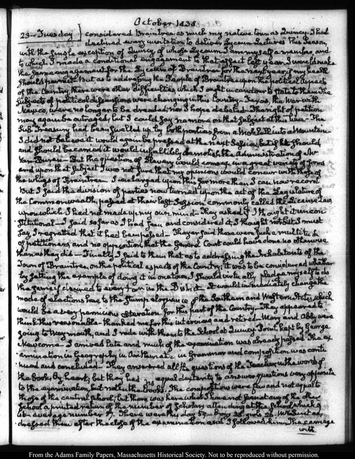View full, authoritative transcriptions with page images of the diaries at John Quincy Adams Digital Diary part of the Primary Source Cooperative at the MHS.