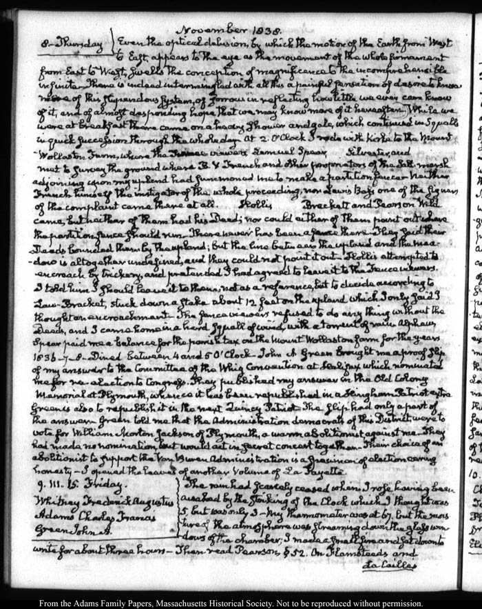 View full, authoritative transcriptions with page images of the diaries at John Quincy Adams Digital Diary part of the Primary Source Cooperative at the MHS.