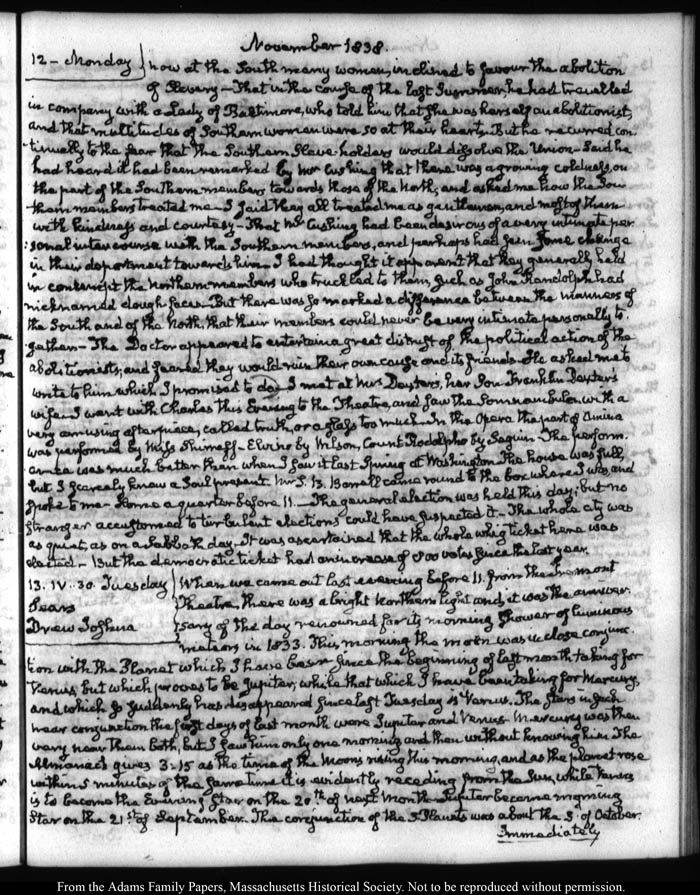 View full, authoritative transcriptions with page images of the diaries at John Quincy Adams Digital Diary part of the Primary Source Cooperative at the MHS.