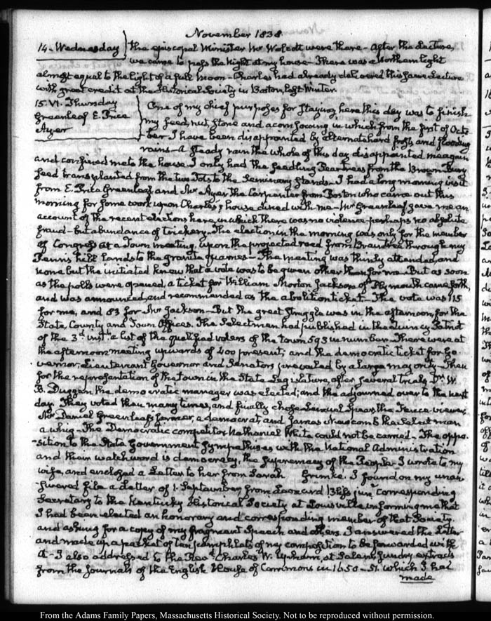 View full, authoritative transcriptions with page images of the diaries at John Quincy Adams Digital Diary part of the Primary Source Cooperative at the MHS.