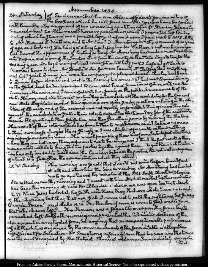 View full, authoritative transcriptions with page images of the diaries at John Quincy Adams Digital Diary part of the Primary Source Cooperative at the MHS.