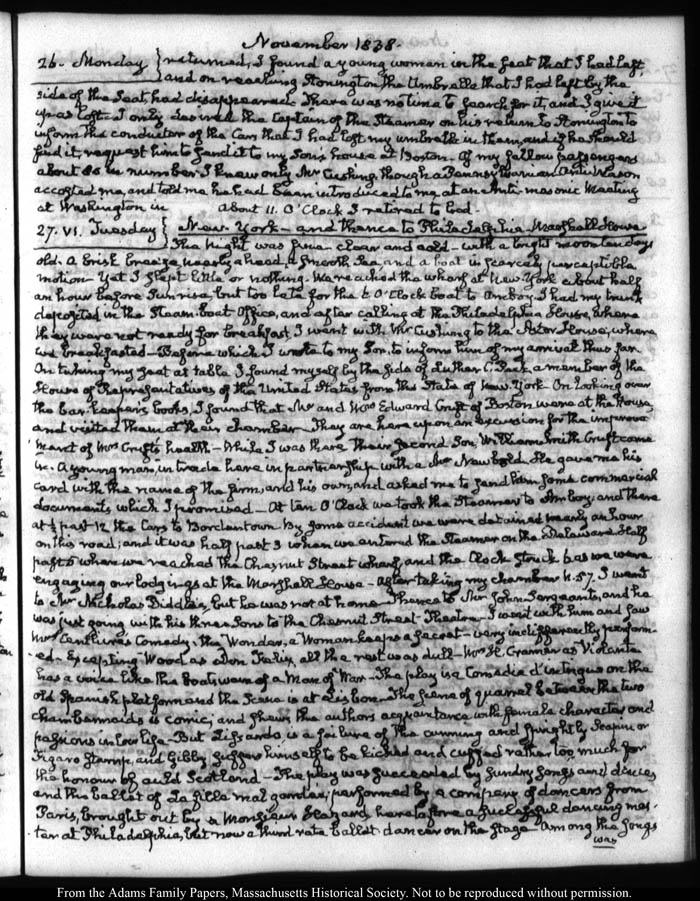 View full, authoritative transcriptions with page images of the diaries at John Quincy Adams Digital Diary part of the Primary Source Cooperative at the MHS.
