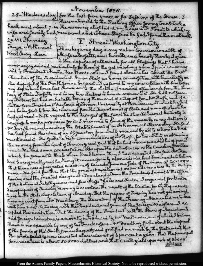 View full, authoritative transcriptions with page images of the diaries at John Quincy Adams Digital Diary part of the Primary Source Cooperative at the MHS.