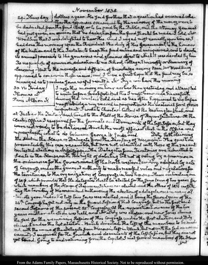 View full, authoritative transcriptions with page images of the diaries at John Quincy Adams Digital Diary part of the Primary Source Cooperative at the MHS.