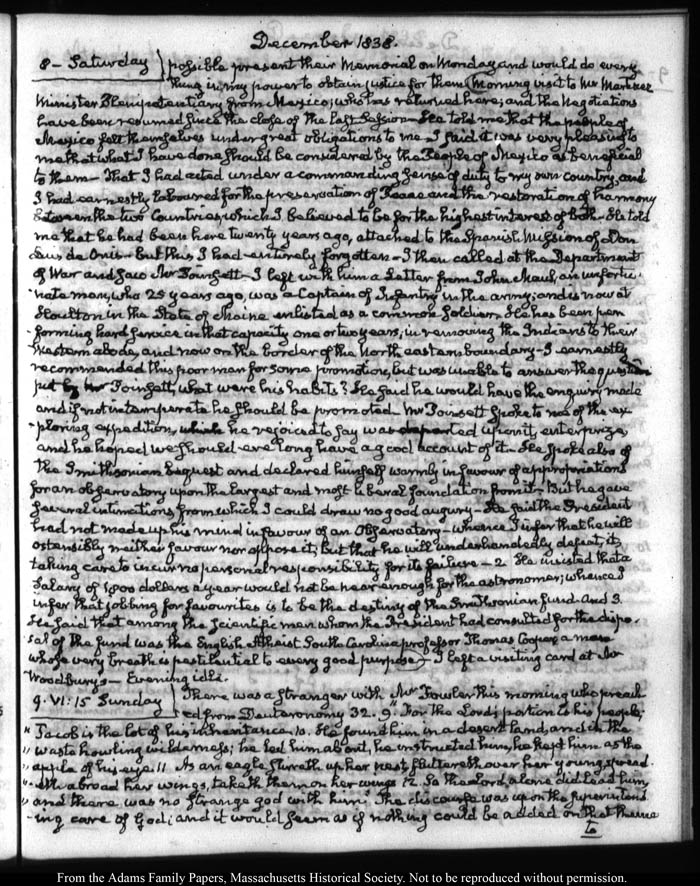 View full, authoritative transcriptions with page images of the diaries at John Quincy Adams Digital Diary part of the Primary Source Cooperative at the MHS.