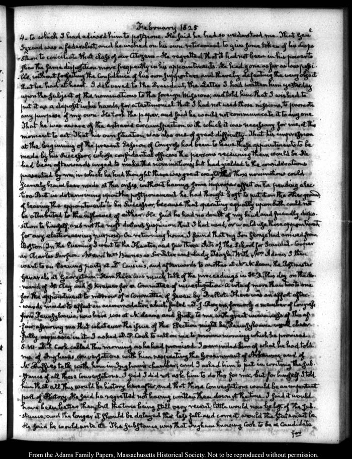 View full, authoritative transcriptions with page images of the diaries at John Quincy Adams Digital Diary part of the Primary Source Cooperative at the MHS.