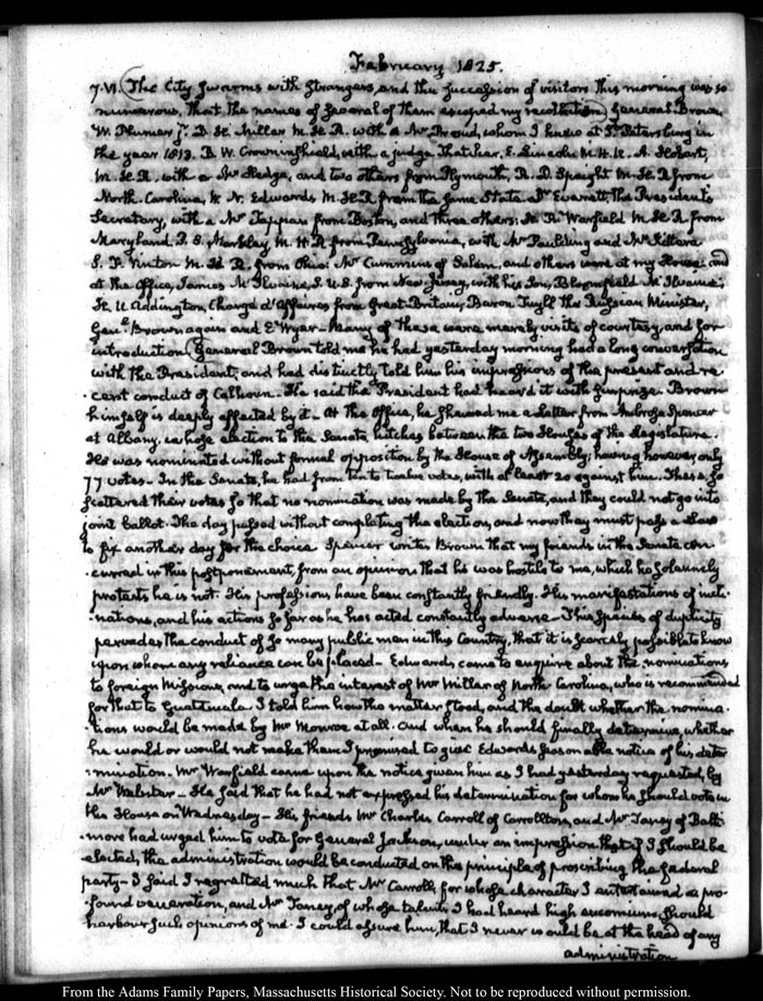 View full, authoritative transcriptions with page images of the diaries at John Quincy Adams Digital Diary part of the Primary Source Cooperative at the MHS.