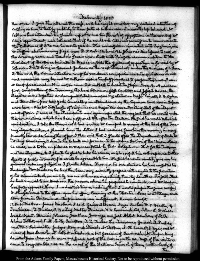 View full, authoritative transcriptions with page images of the diaries at John Quincy Adams Digital Diary part of the Primary Source Cooperative at the MHS.