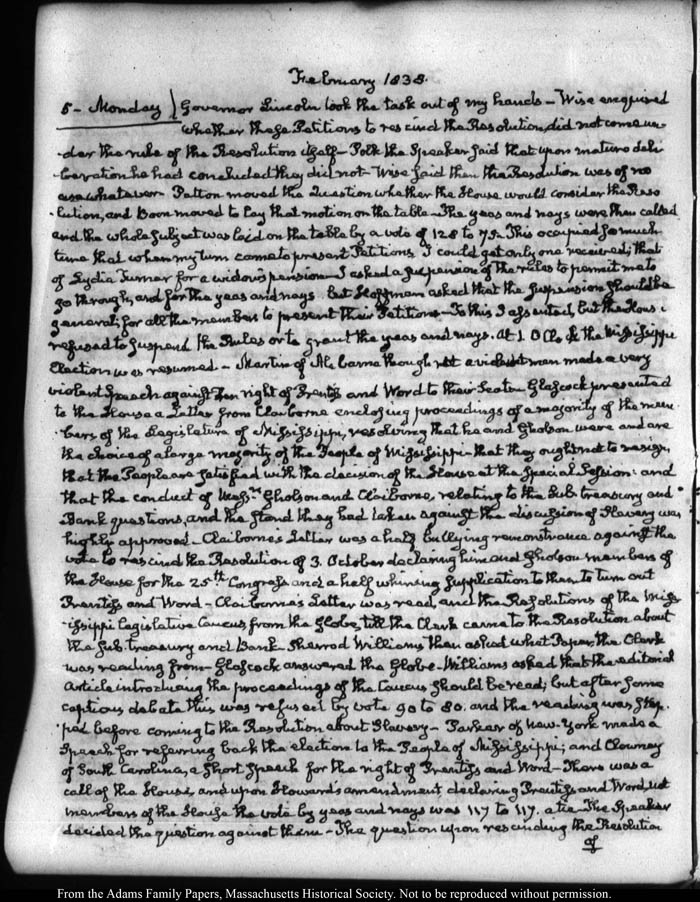 View full, authoritative transcriptions with page images of the diaries at John Quincy Adams Digital Diary part of the Primary Source Cooperative at the MHS.