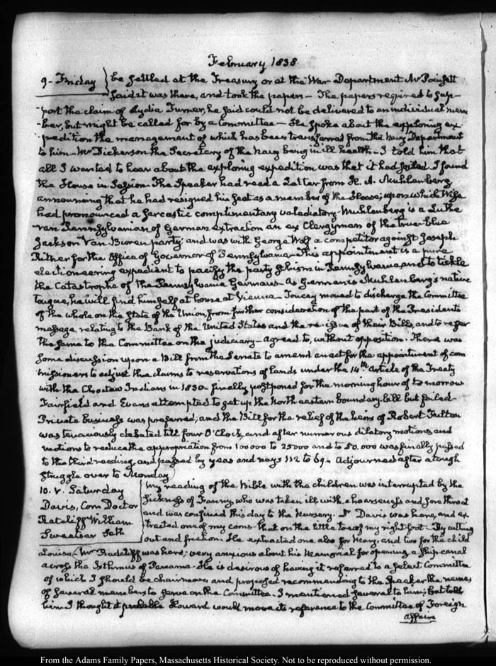 View full, authoritative transcriptions with page images of the diaries at John Quincy Adams Digital Diary part of the Primary Source Cooperative at the MHS.