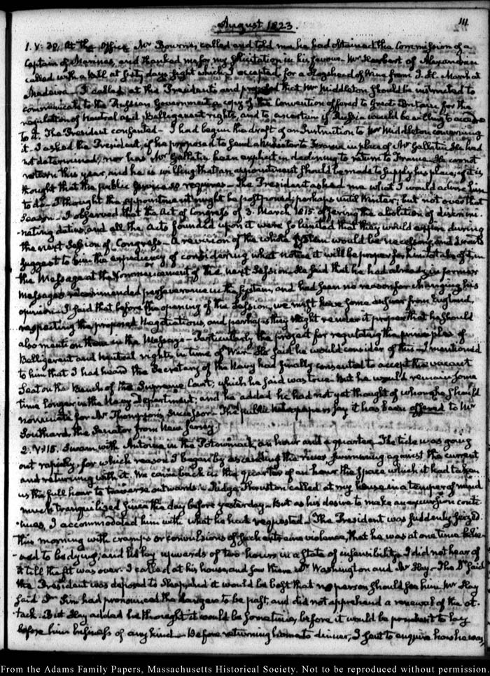 View full, authoritative transcriptions with page images of the diaries at John Quincy Adams Digital Diary part of the Primary Source Cooperative at the MHS.