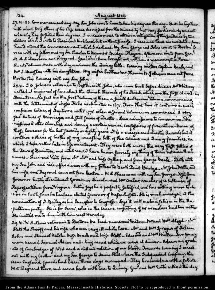 View full, authoritative transcriptions with page images of the diaries at John Quincy Adams Digital Diary part of the Primary Source Cooperative at the MHS.