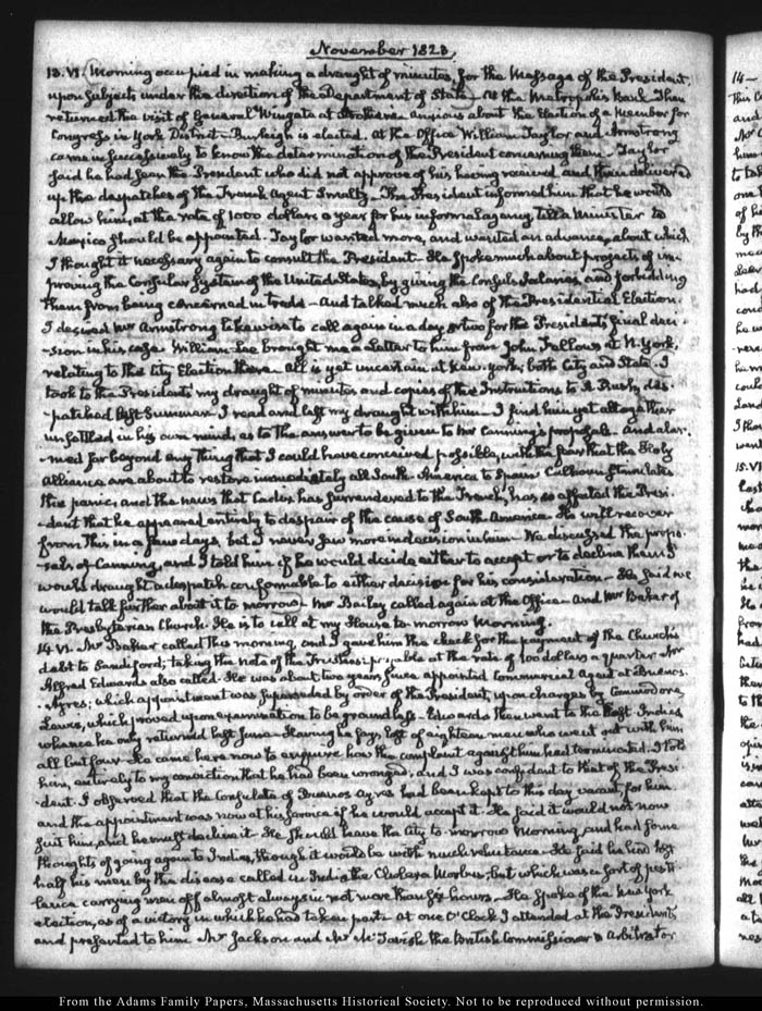 View full, authoritative transcriptions with page images of the diaries at John Quincy Adams Digital Diary part of the Primary Source Cooperative at the MHS.