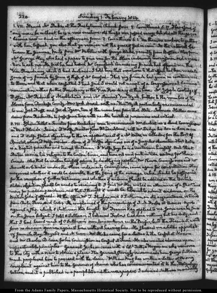 View full, authoritative transcriptions with page images of the diaries at John Quincy Adams Digital Diary part of the Primary Source Cooperative at the MHS.