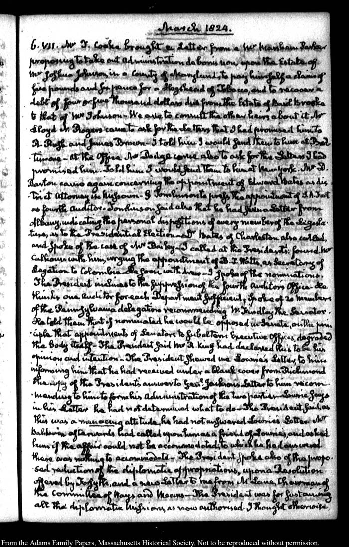 View full, authoritative transcriptions with page images of the diaries at John Quincy Adams Digital Diary part of the Primary Source Cooperative at the MHS.