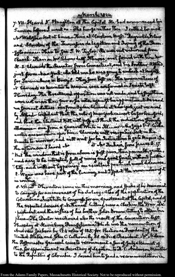 View full, authoritative transcriptions with page images of the diaries at John Quincy Adams Digital Diary part of the Primary Source Cooperative at the MHS.