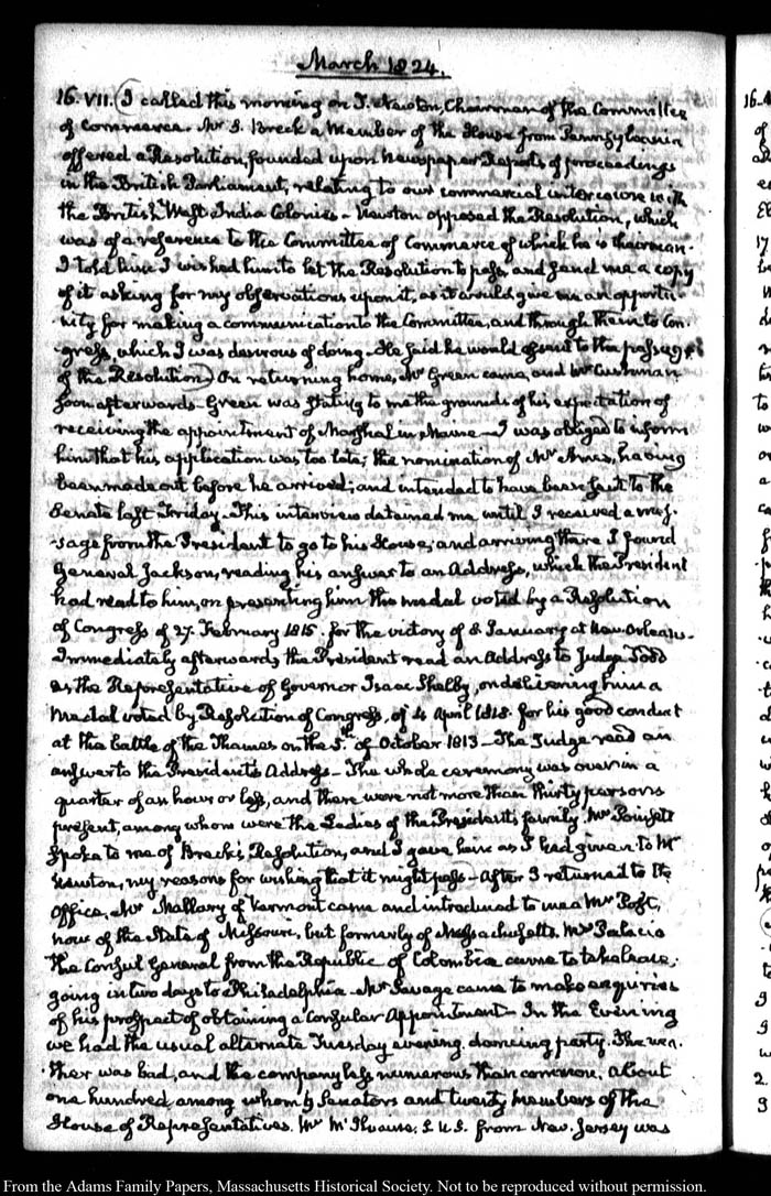 View full, authoritative transcriptions with page images of the diaries at John Quincy Adams Digital Diary part of the Primary Source Cooperative at the MHS.