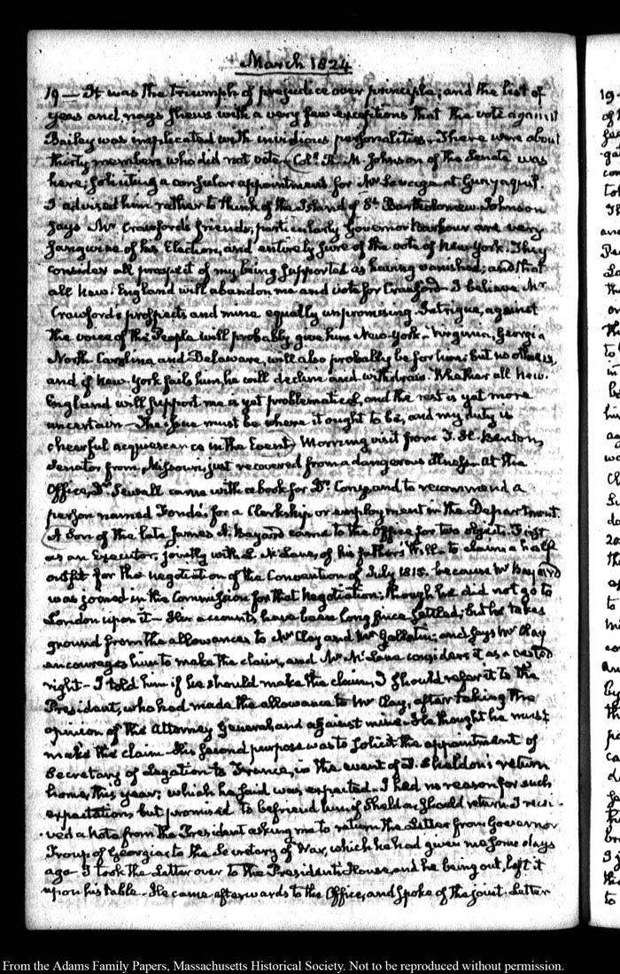 View full, authoritative transcriptions with page images of the diaries at John Quincy Adams Digital Diary part of the Primary Source Cooperative at the MHS.