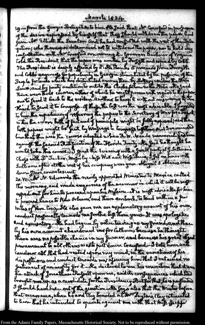 View full, authoritative transcriptions with page images of the diaries at John Quincy Adams Digital Diary part of the Primary Source Cooperative at the MHS.