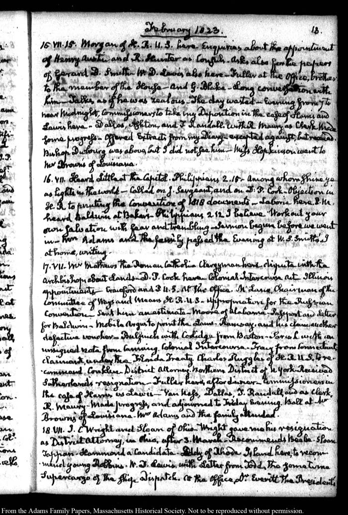 John Quincy Adams diary 35, 25 January 1823 - 31 October 1826, 5 November 1828, and 15 August 1844, page 13