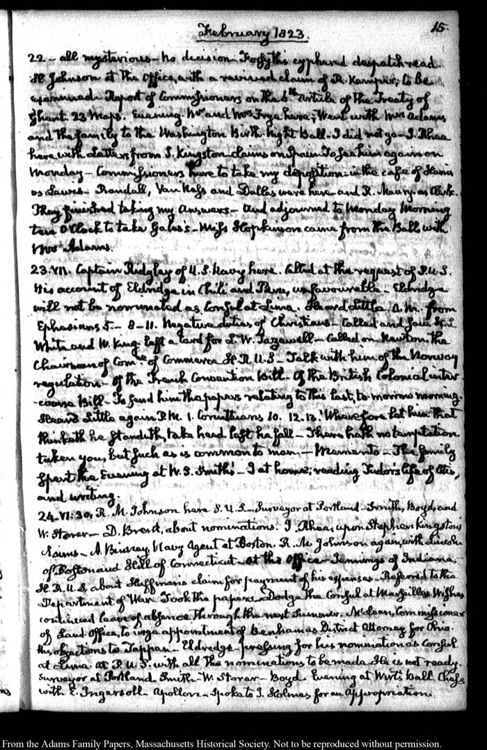 John Quincy Adams diary 35, 25 January 1823 - 31 October 1826, 5 November 1828, and 15 August 1844, page 15