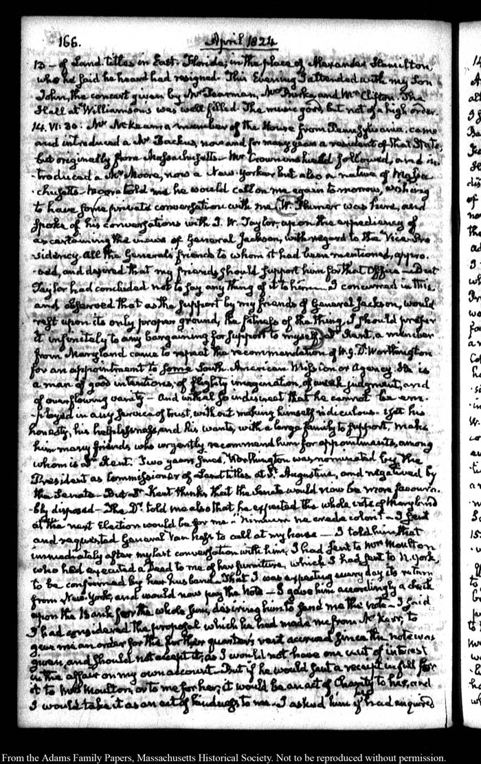 John Quincy Adams diary 35, 25 January 1823 - 31 October 1826, 5 November 1828, and 15 August 1844, page 166