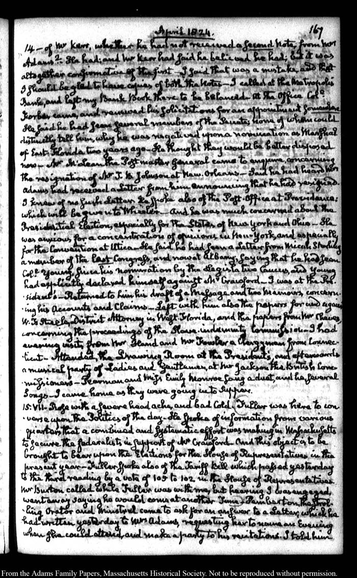 John Quincy Adams diary 35, 25 January 1823 - 31 October 1826, 5 November 1828, and 15 August 1844, page 167
