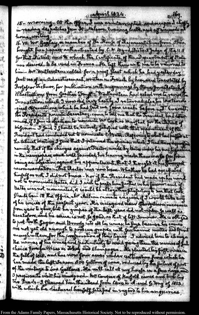 John Quincy Adams diary 35, 25 January 1823 - 31 October 1826, 5 November 1828, and 15 August 1844, page 169