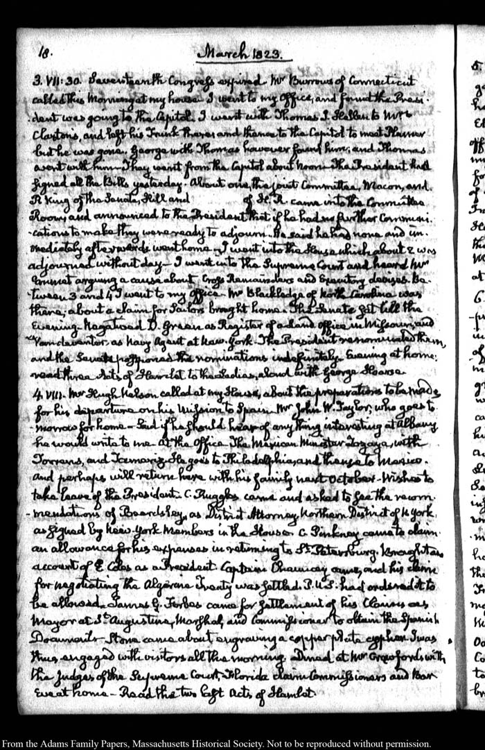 John Quincy Adams diary 35, 25 January 1823 - 31 October 1826, 5 November 1828, and 15 August 1844, page 18