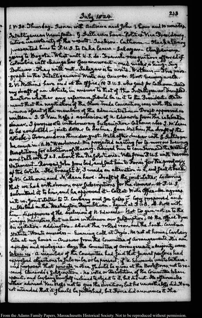 John Quincy Adams diary 35, 25 January 1823 - 31 October 1826, 5 November 1828, and 15 August 1844, page 213