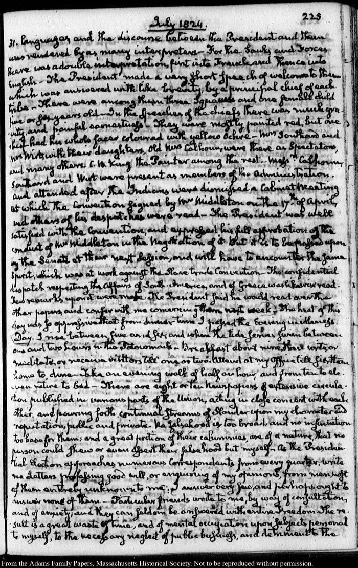 John Quincy Adams diary 35, 25 January 1823 - 31 October 1826, 5 November 1828, and 15 August 1844, page 225