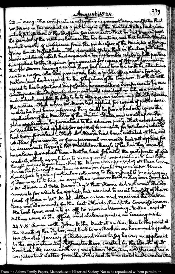 John Quincy Adams diary 35, 25 January 1823 - 31 October 1826, 5 November 1828, and 15 August 1844, page 239