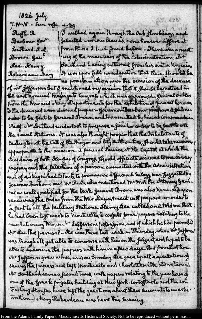 View full, authoritative transcriptions with page images of the diaries at John Quincy Adams Digital Diary part of the Primary Source Cooperative at the MHS.