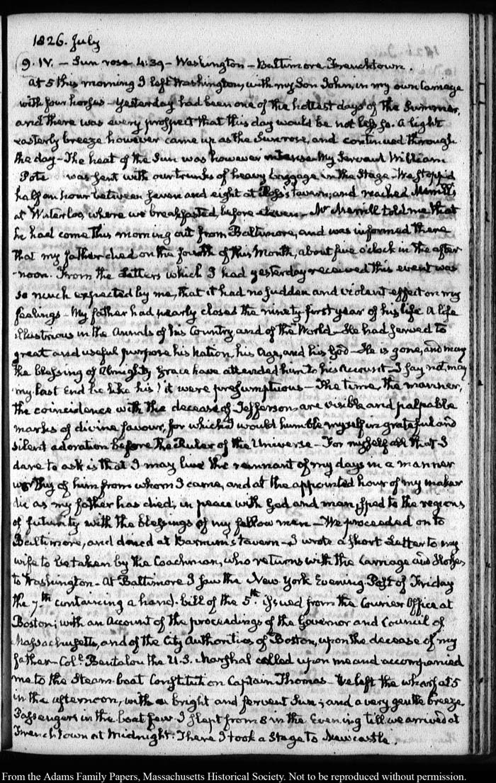 View full, authoritative transcriptions with page images of the diaries at John Quincy Adams Digital Diary part of the Primary Source Cooperative at the MHS.