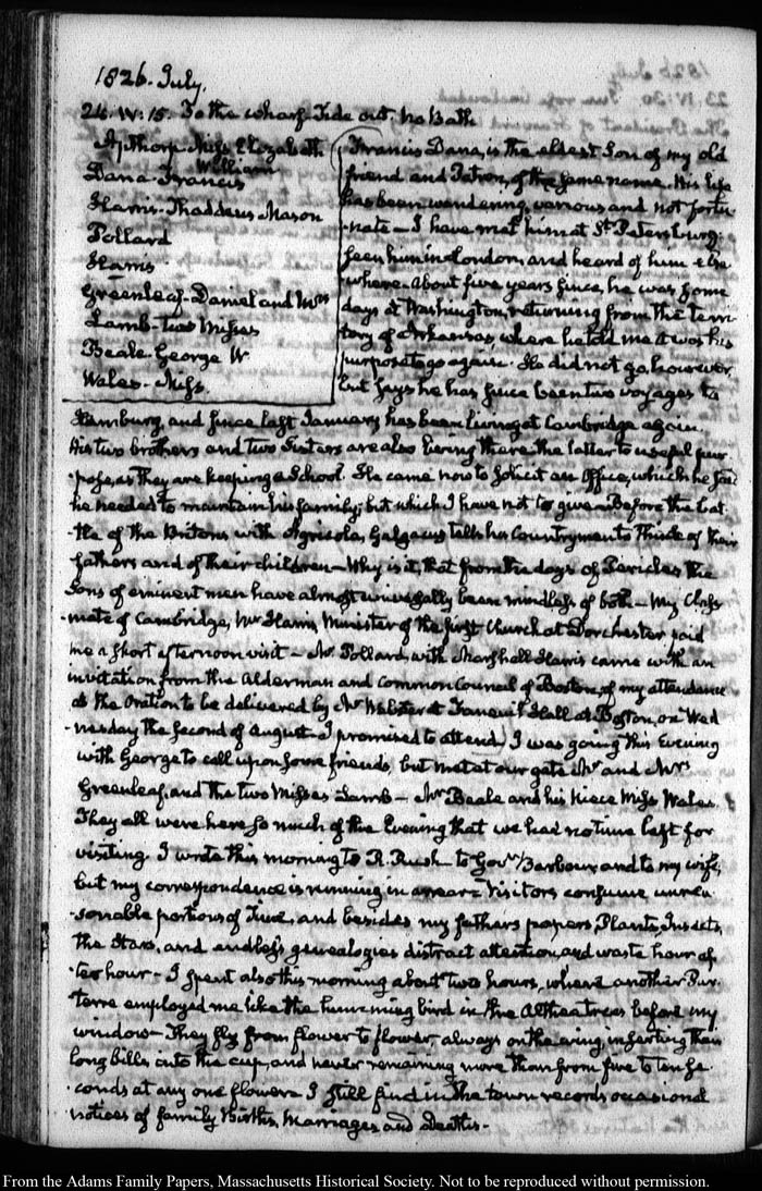 View full, authoritative transcriptions with page images of the diaries at John Quincy Adams Digital Diary part of the Primary Source Cooperative at the MHS.