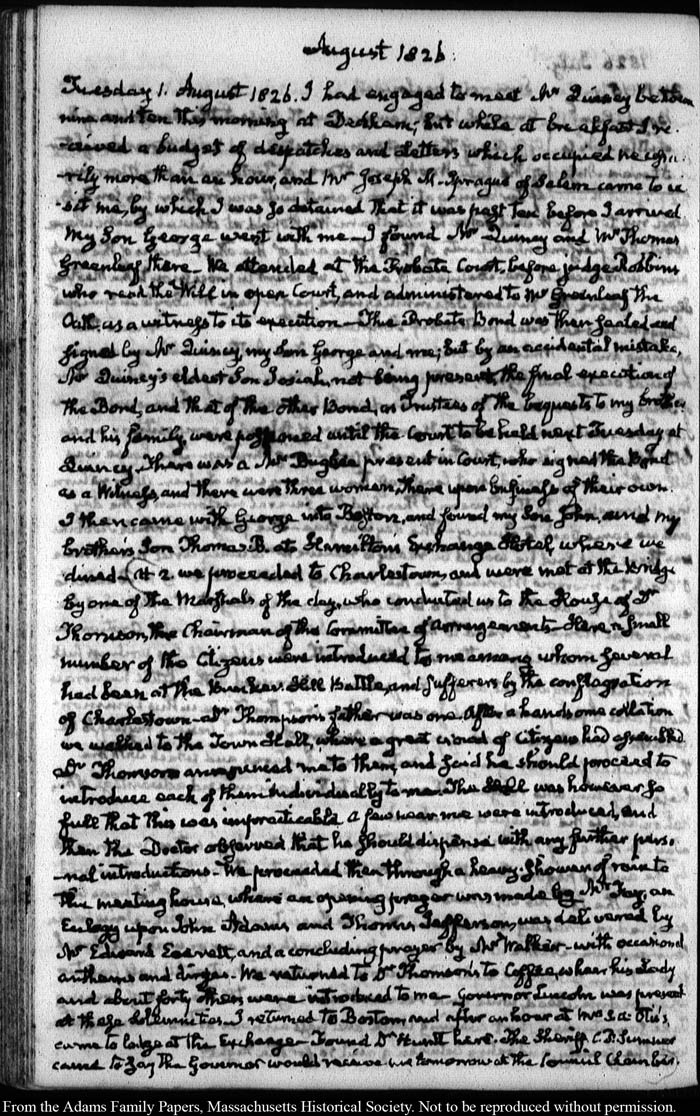 View full, authoritative transcriptions with page images of the diaries at John Quincy Adams Digital Diary part of the Primary Source Cooperative at the MHS.