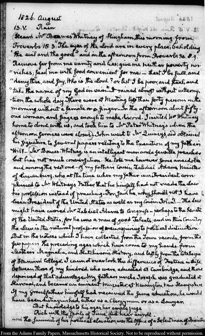 View full, authoritative transcriptions with page images of the diaries at John Quincy Adams Digital Diary part of the Primary Source Cooperative at the MHS.