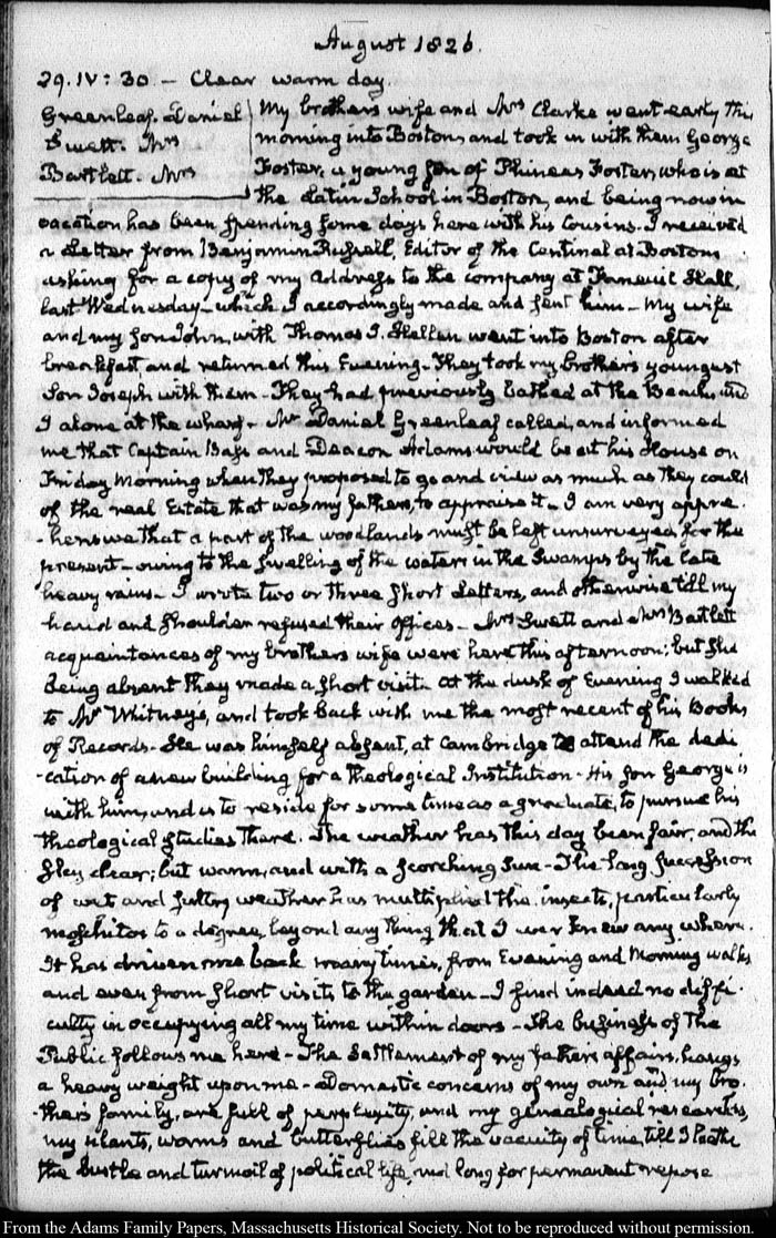 View full, authoritative transcriptions with page images of the diaries at John Quincy Adams Digital Diary part of the Primary Source Cooperative at the MHS.