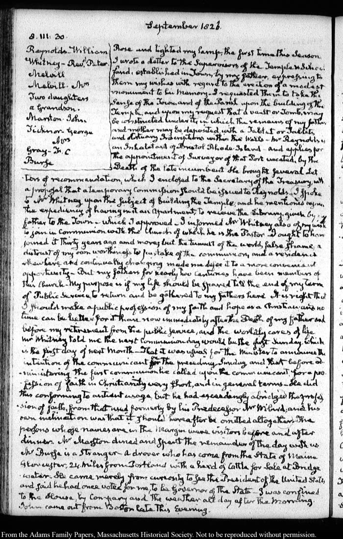 View full, authoritative transcriptions with page images of the diaries at John Quincy Adams Digital Diary part of the Primary Source Cooperative at the MHS.