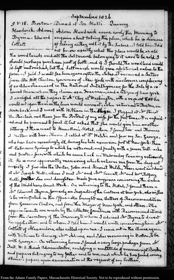 View full, authoritative transcriptions with page images of the diaries at John Quincy Adams Digital Diary part of the Primary Source Cooperative at the MHS.