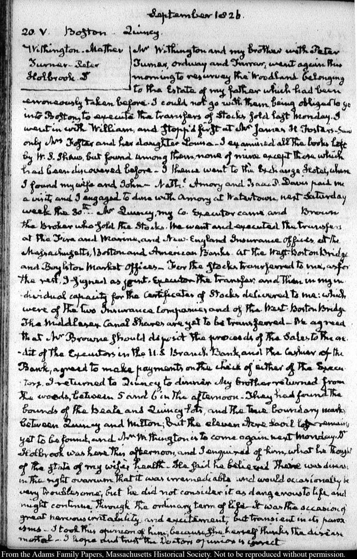 View full, authoritative transcriptions with page images of the diaries at John Quincy Adams Digital Diary part of the Primary Source Cooperative at the MHS.