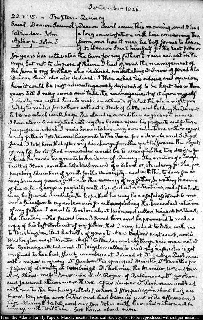 View full, authoritative transcriptions with page images of the diaries at John Quincy Adams Digital Diary part of the Primary Source Cooperative at the MHS.